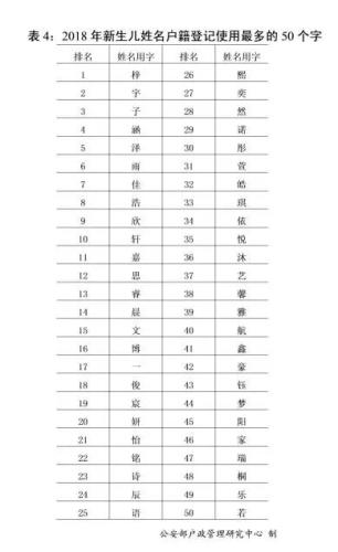 根据报告可以看出,2018年,公安机关登记的新生儿名字中,使用频率最高的50个字为“梓”“宇”“子”“涵”“泽”“雨”“佳”“浩”“欣”“轩”等。