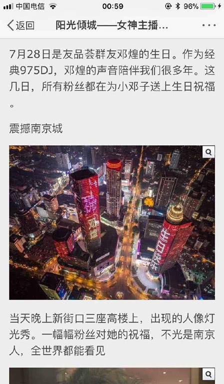 美女主播"高调庆生"遭网友质疑近日,多位网友在网络上公开曝光江苏一美女主播邓某高调庆祝自己生日。网友称,去年7月28日是邓某的生日,当晚在南京繁华商圈新街口一处大楼上演长达10小时生日灯光秀,整个大楼流光溢彩,"邓某,生日快乐!"的祝福语出现在大楼电子屏上,空中直升机全种航拍。