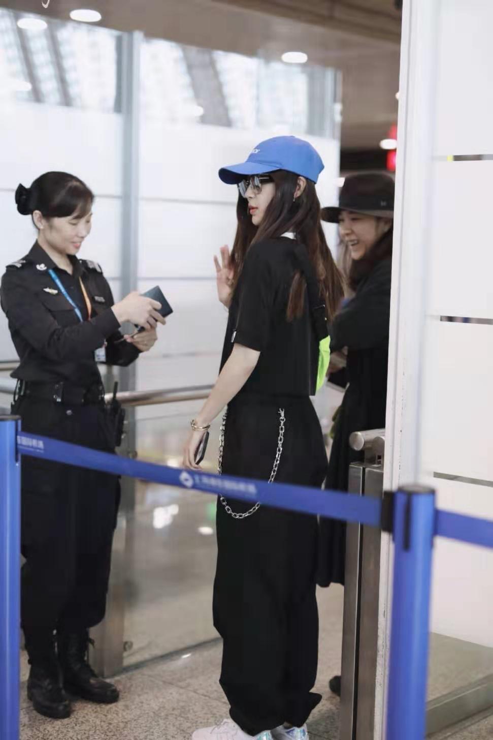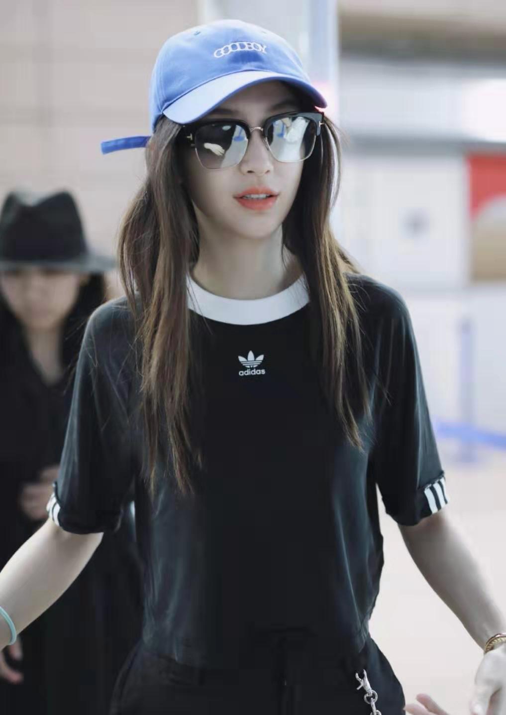 头戴蓝色棒球帽,长发披肩,大大的太阳镜遮住了上半张脸,脸颊显得越发的小巧精致,并不过分艳丽的红唇恰到好处的凸显气质,即使是刚下飞机整体面容也不显疲倦劳累,反而是非常美丽有色泽,颜值真的非常令人服气了。