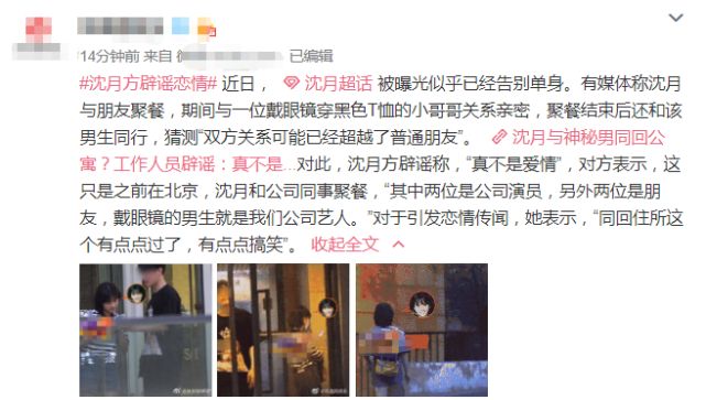 就此消息,有媒体询问了沈月方的工作人员,对方进行辟谣称“真不是爱情”,对方表示,这只是之前在北京,沈月和公司同事聚餐,“其中两位是公司演员,另外两位是朋友,戴眼镜的男生就是我们公司艺人。”此外沈月表示“同回住所这个有点点过了,有点点搞笑”。