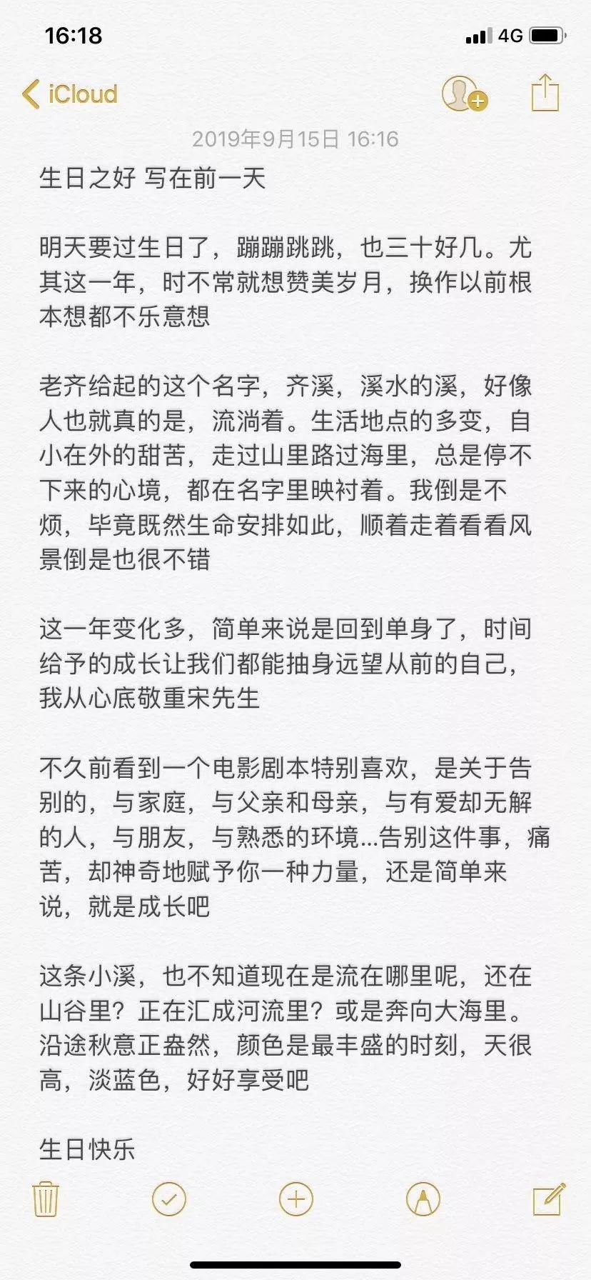 齐溪35岁生日时,在朋友圈发表了自己的备忘录心得,并且公布了自己离婚的消息。“这一年变化多,简单来说是回到单身了,时间给予的成长让我们都能抽身远望从前的自己,我从心底敬重宋先生。”