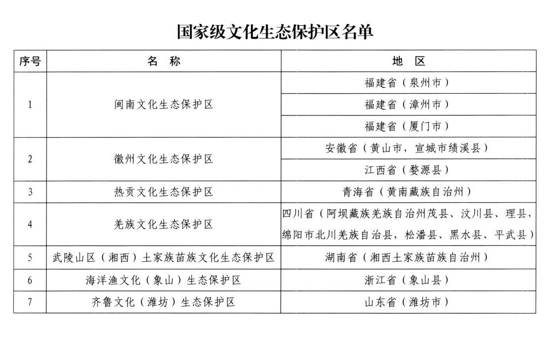 7处包括闽南文化生态保护区、徽州文化生态保护区、热贡文化生态保护区、羌族文化生态保护区、武陵山区(湘西)土家族苗族文化生态保护区、海洋渔文化(象山)生态保护区、齐鲁文化(潍坊)生态保护区。