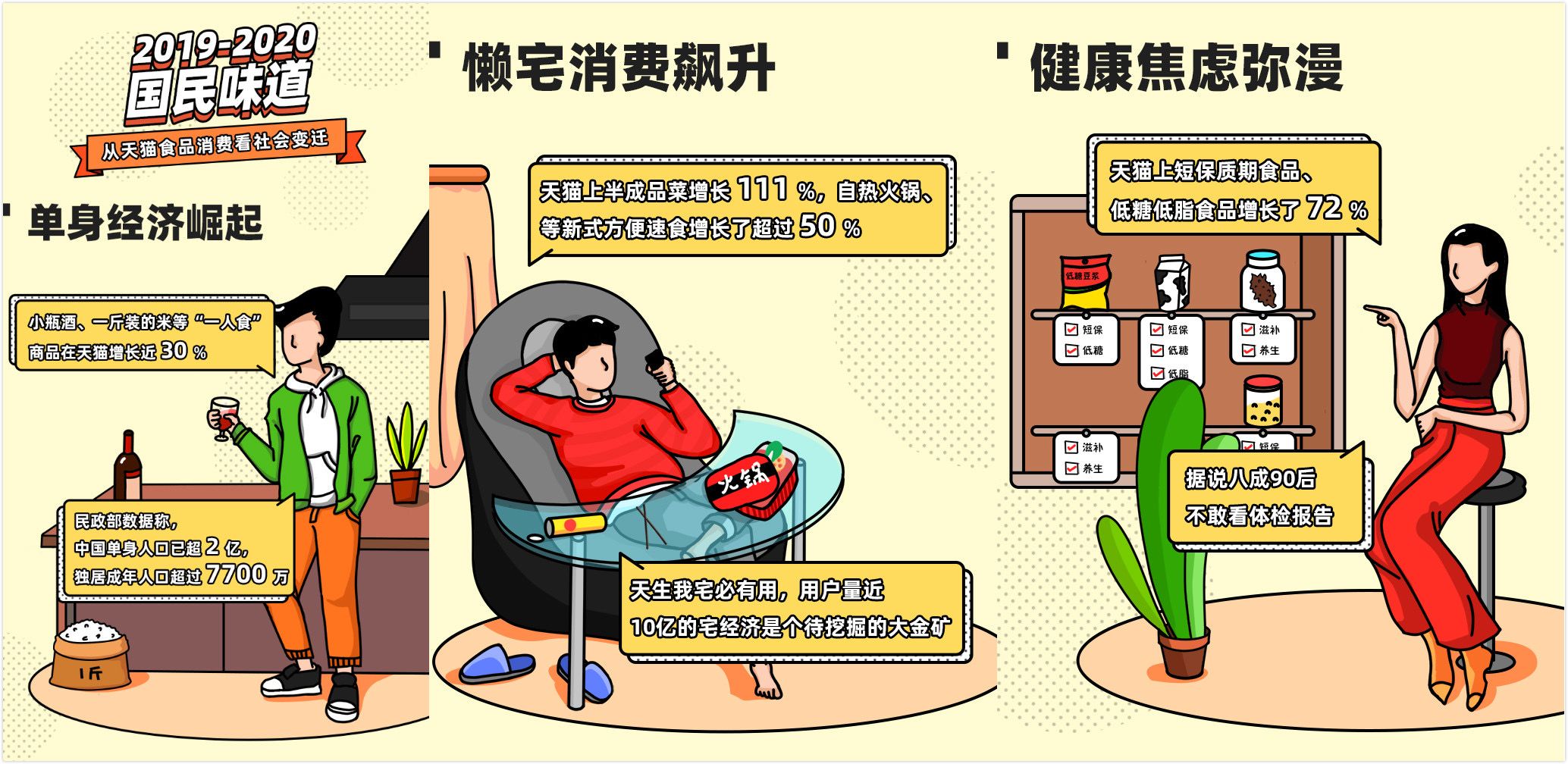 据国家民政部数据,2018年中国单身人群已超过2亿,成年独居人口高达7700万。在新趋势中,2019年,“一人食”的商品销量在天猫同比上涨30%。