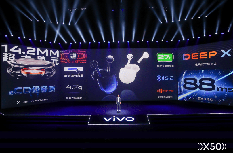 除此之外,随vivo X50系列共同发布的还有vivo TWS Neo真无线耳机,主打好音质、低延迟。14.2mm超大单元可以带来更加澎湃的音质效果,88ms超低延迟不仅刷新业界标准,更能让用户在游戏体验中真实感受低延迟的效果。同时,vivo TWS Neo真无线耳机还具备aptX高清解码、27小时超长续航、一键闪连、双重佩戴检测等诸多卖点。